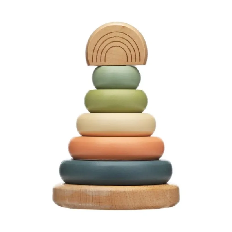 - Includes wooden base and peg with 5 multicolor earth tone rings and a wooden rainbow topper