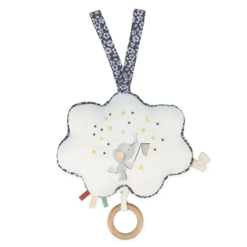 Kaloo Fabric Music Box is perfect for the nursery to help sooth baby to sleep. Nursery rhymes accompanied by gestures stimulate language, attention, curiosity, but also motor development of toddlers. The delicately printed and embroidered fabric music box is a key element in baby’s development. If you pull on the wooden ring at the end of the string, you will hear the French version of ‘Twinkle, Twinkle, Little Star’ or ‘Little Rabbit’ so you can sing it to baby. Its small in size of 15cm and its ribbon allows it to be carried and hung anywhere. The music case is waterproof so you can easily wash the cushion by hand without risk.