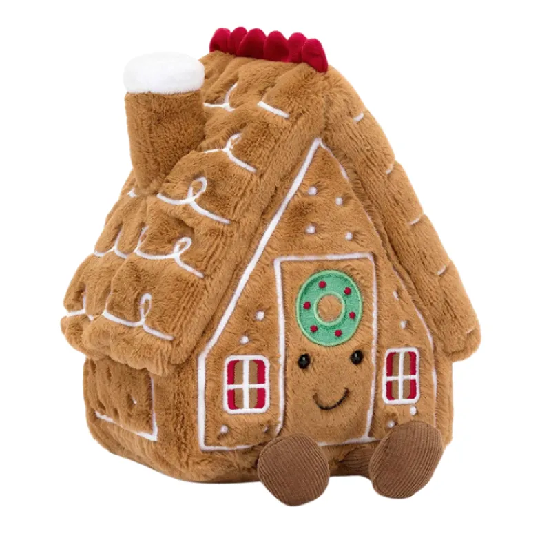 - This richly textured golden house is covered with delicious detail, from loop-de-loop icing slates to a chunky chimney and even a wreath embroidered on the door! With stitched windows, snowy speckles, corduroy boots and a welcoming smile, this cuddly house is a bold centerpiece.