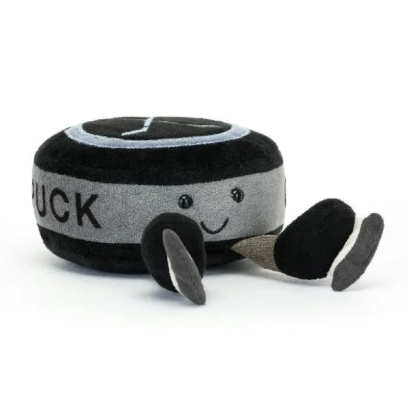 - Ice Hockey Puck: is 5 x 4 inches and has stunningly textured, with soft black fur, a grey tummy band and denim-blue suedette patches, topped with embroidered hockey sticks. With mocha cord legs and funky skates in black, cream and grey faux-suede, this puck’s absolutely a winner.