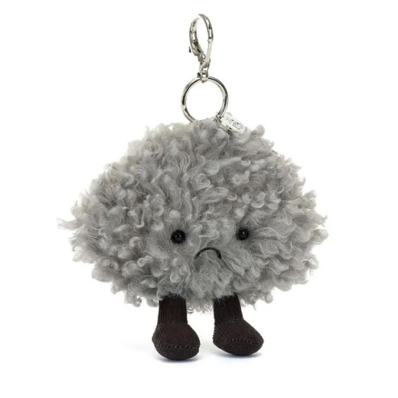 - Storm Cloud: (7″ x 5″ 2″) Fluffy but grumpy in textured grey fur, it’s the Amuseables Storm Cloud Bag Charm! With a big, stitched frown and kicking fine cord boots, this storm cloud clips onto your bag with a silver claw and a Jellycat disc. The perfect companion to bring joy, even with a frown!
