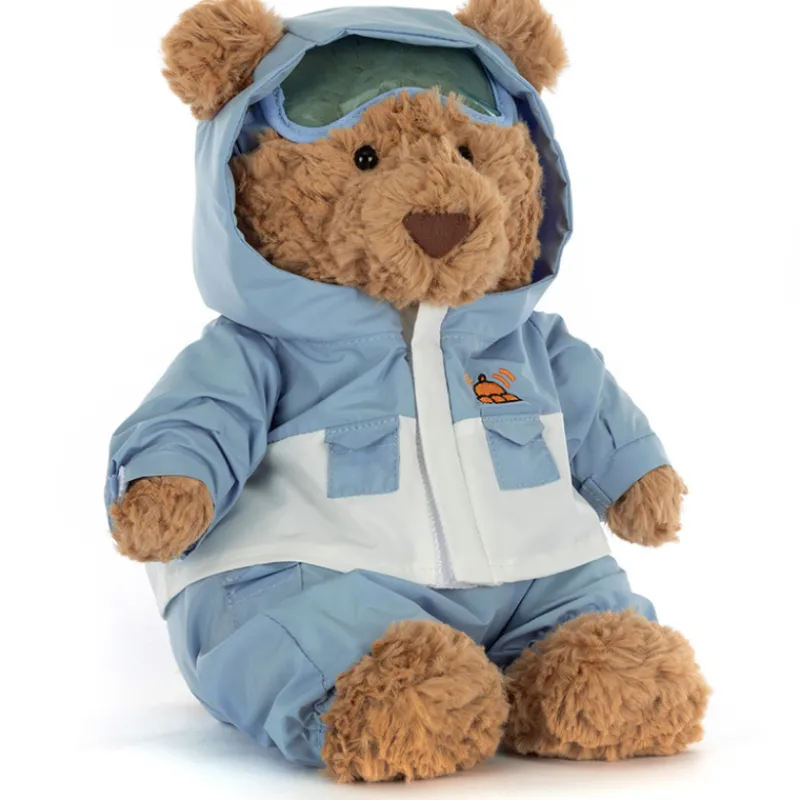 - Bartholomew Bear dressed in a plush, snow-ready snowsuit with fluffy trim