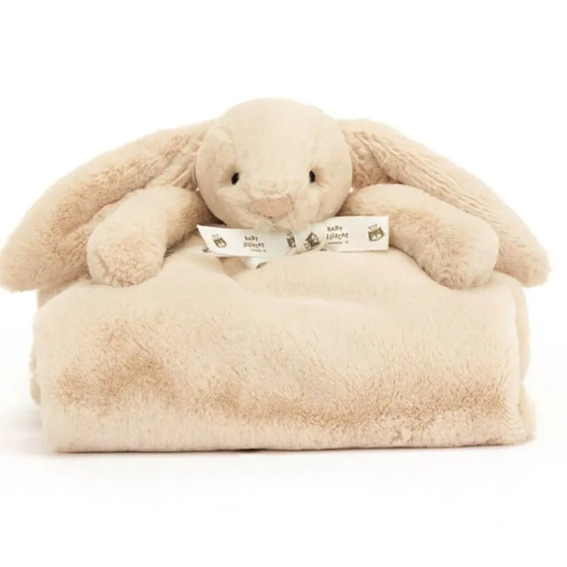 A luxurious newborn gift, the Bashful Luxe Bunny Blankie is exquisitely soft in a latte hued fur. Featuring the head and paws of Bunny in the corner of a silky soft blanket. Rolled and wrapped with a grosgrain ribbon and elegantly presented in a satin sheen gift box with a gold foil detail and matching gift card.