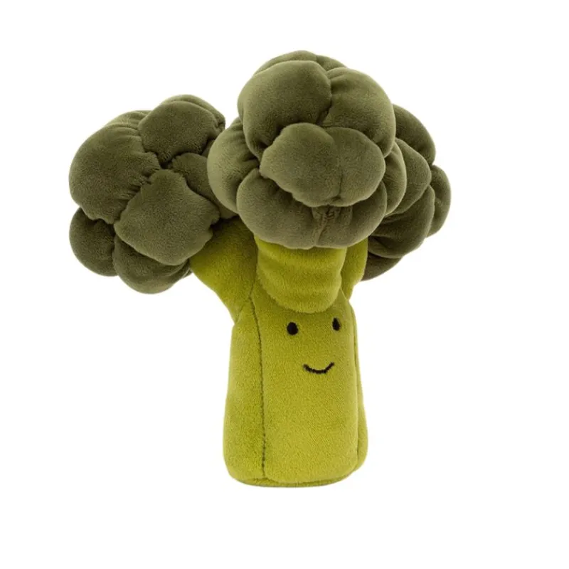 - Broccoli: Greens are good for you – this one brightens our day with a smile! Vivacious Vegetable Broccoli is a funky floret of bobbly fun! With stretchy-soft fur in lime and moss green, this squashy broccoli is soothing and snuggly. (6.3″ x 5.1″ x 5.1″)
