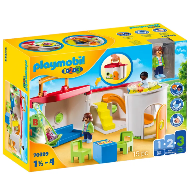 - Includes: Take Along Preschool, teacher figure, two child figures, swing, spinning saucer ride, slide, staircase, and more!Â