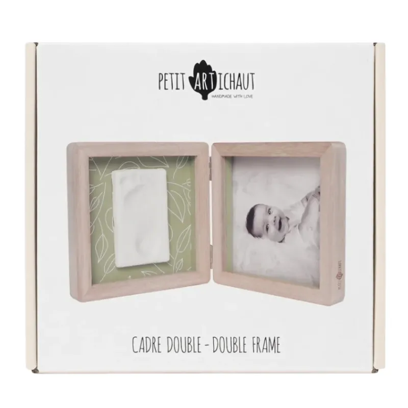 The Double Frame from Petit Artichaut offers a unique way to display both a photo and a baby imprint. This 2-panel standing frame combines a photo on one side with an imprint on the other. Choose your favourite design by using the reversible background.