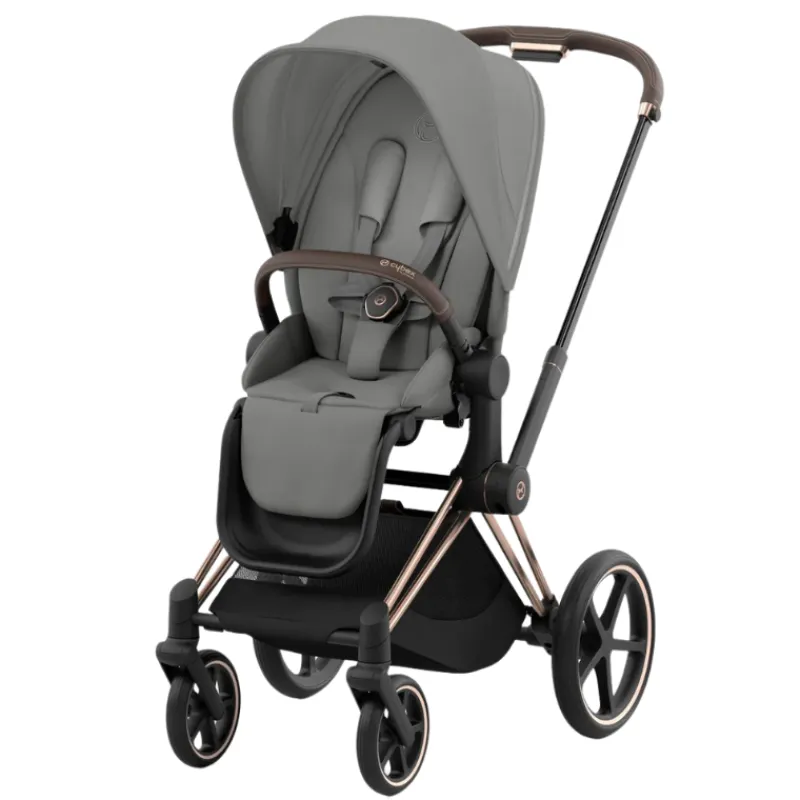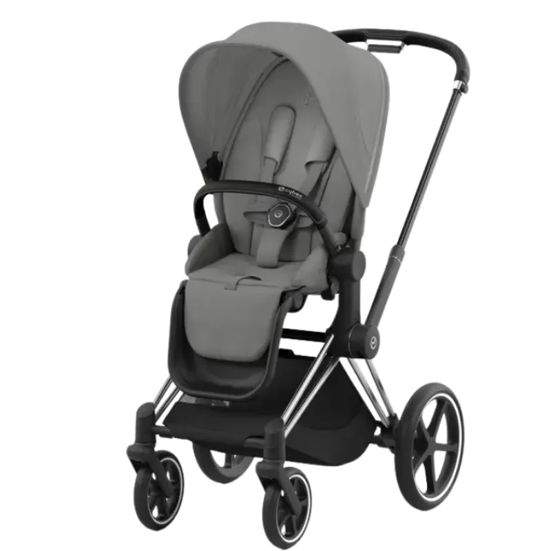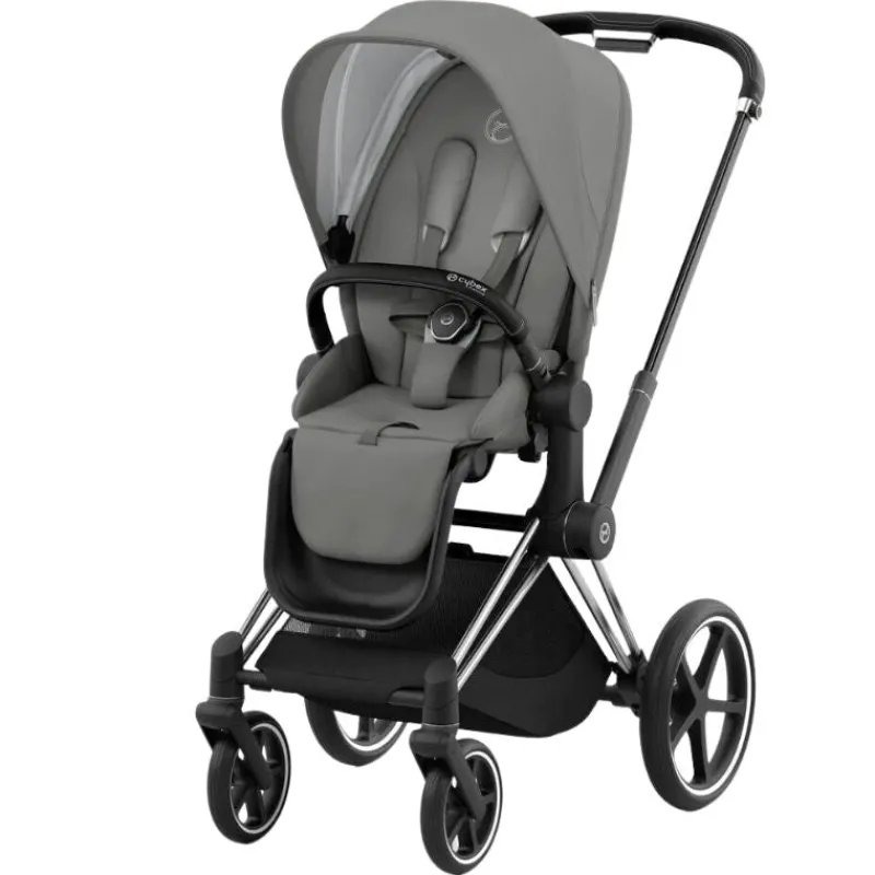 The CYBEX PRIAM 4 stroller combines timeless design elements with new features that make life even easier and meet your highest expectations. The unique one-pull harness helps you secure your child in the stroller in seconds, with just one hand. One frame enables three different modes of use: from birth with the PRIAM 4/e-PRIAM 2 Lux carry cot or any CYBEX infant car seat (both sold separately), and later with the seat unit as a luxurious parent-facing or forward-facing stroller.Â