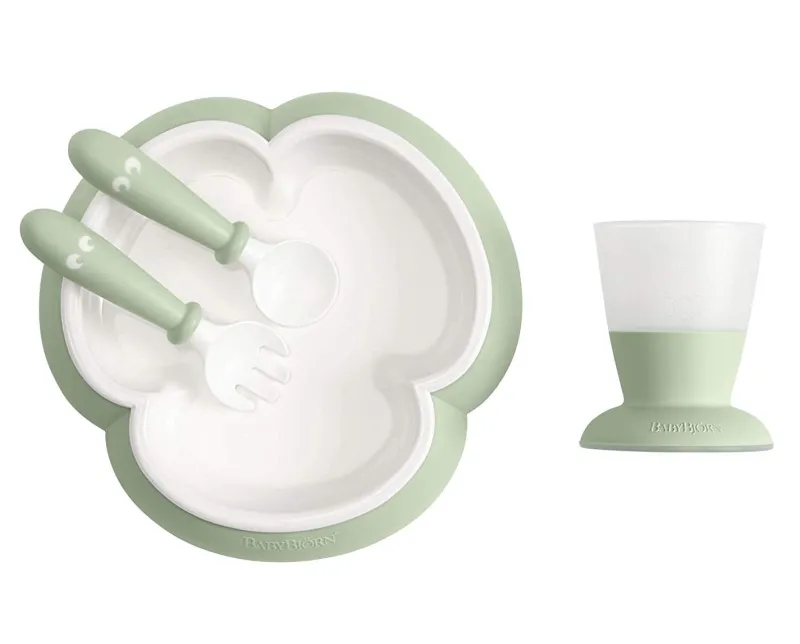 Yay, your baby is ready to self-feed! Use this feeding set from BabyBjorn to get them started. This smart baby feeding set was designed for small hands!